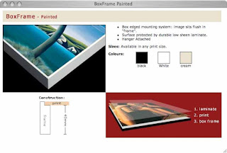 The illustration shows how prints were framed during the trial period (this style is known as a "box frame") and we offered three colours of picture frame - white, black and cream. Black is by far the most popular frame colour choice so far...