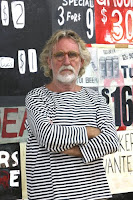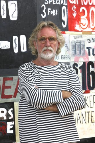Here is the explanation. Dick Frizzell (1943 - ) - shown here standing in front of some of his recent paintings (in what we suspect is also his favourite black and white striped top) has been one of NZ's most high profile and popular contemporary artists since the 1970s. He continues to produce paintings and prints as well as recently designing artwork for The Great NZ Songbook project and even the 2011 Rugby World Cup to be held in NZ.