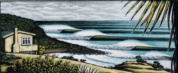 Tony Ogle has released a new print, a large work of art called "Indicators - Raglan". This is one of Ogle's surfing series of prints - the surf break at Raglan is world famous and is the first point of three, hence for surfers down the line looking up at the first point they can see the 'Indication" of larger waves coming which gave this print its name - 'Indicators".